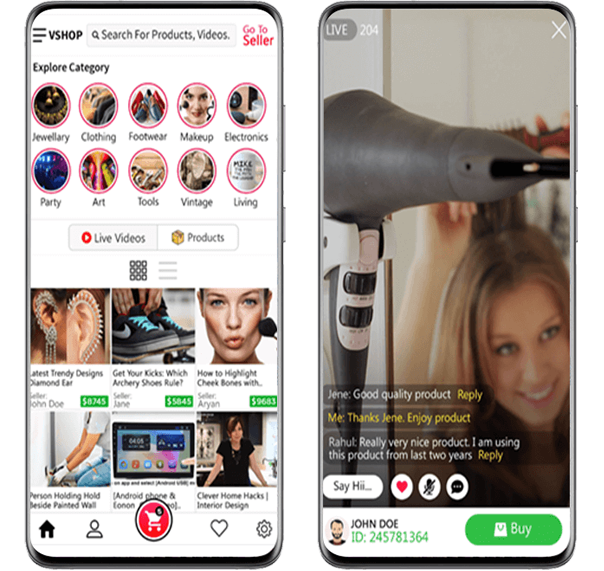 V-Shop is a marketplace mobile app that also facilitates sellers to go live with their products demonstration. Buyers can chat on live video to ask seller to show the products from different dimensions etc.